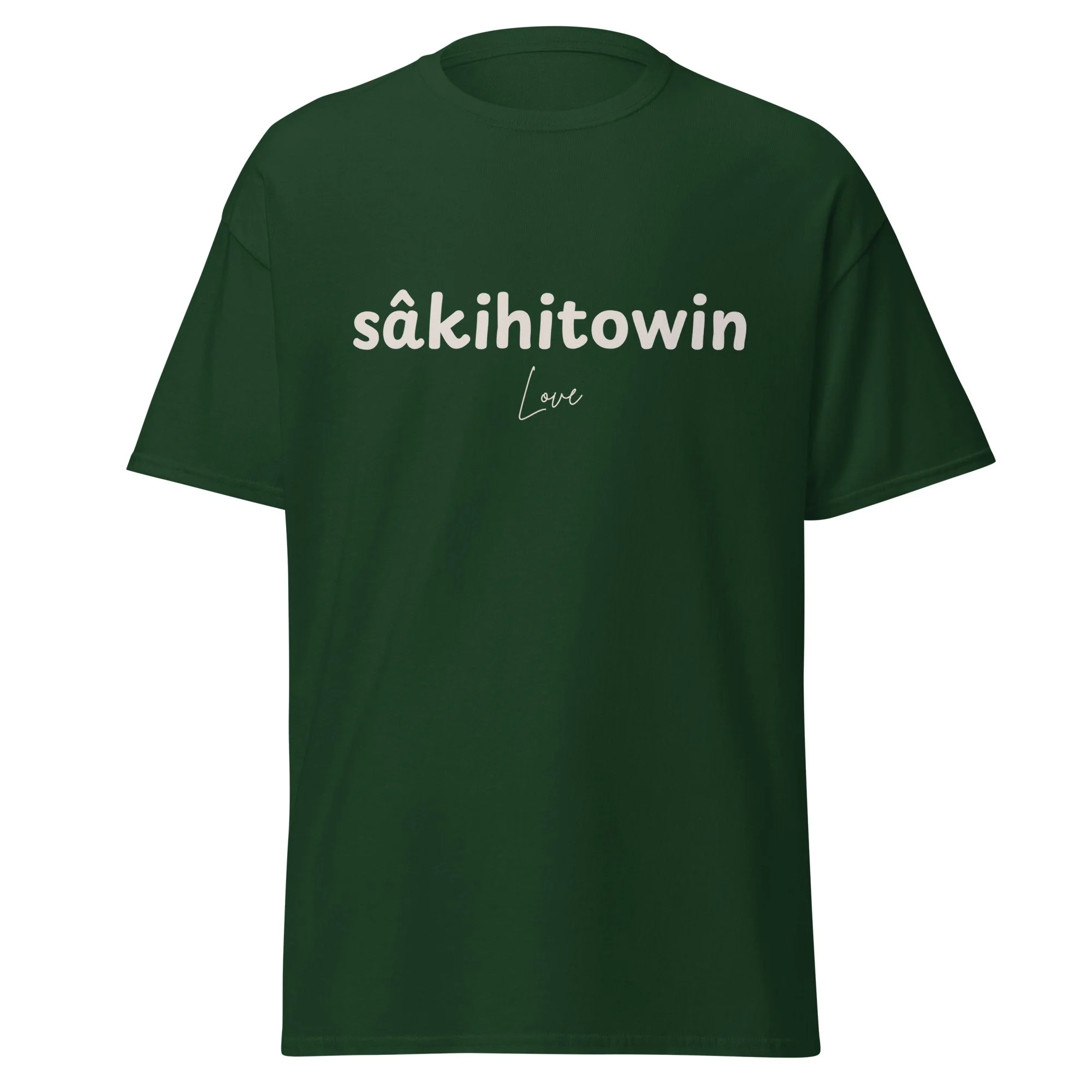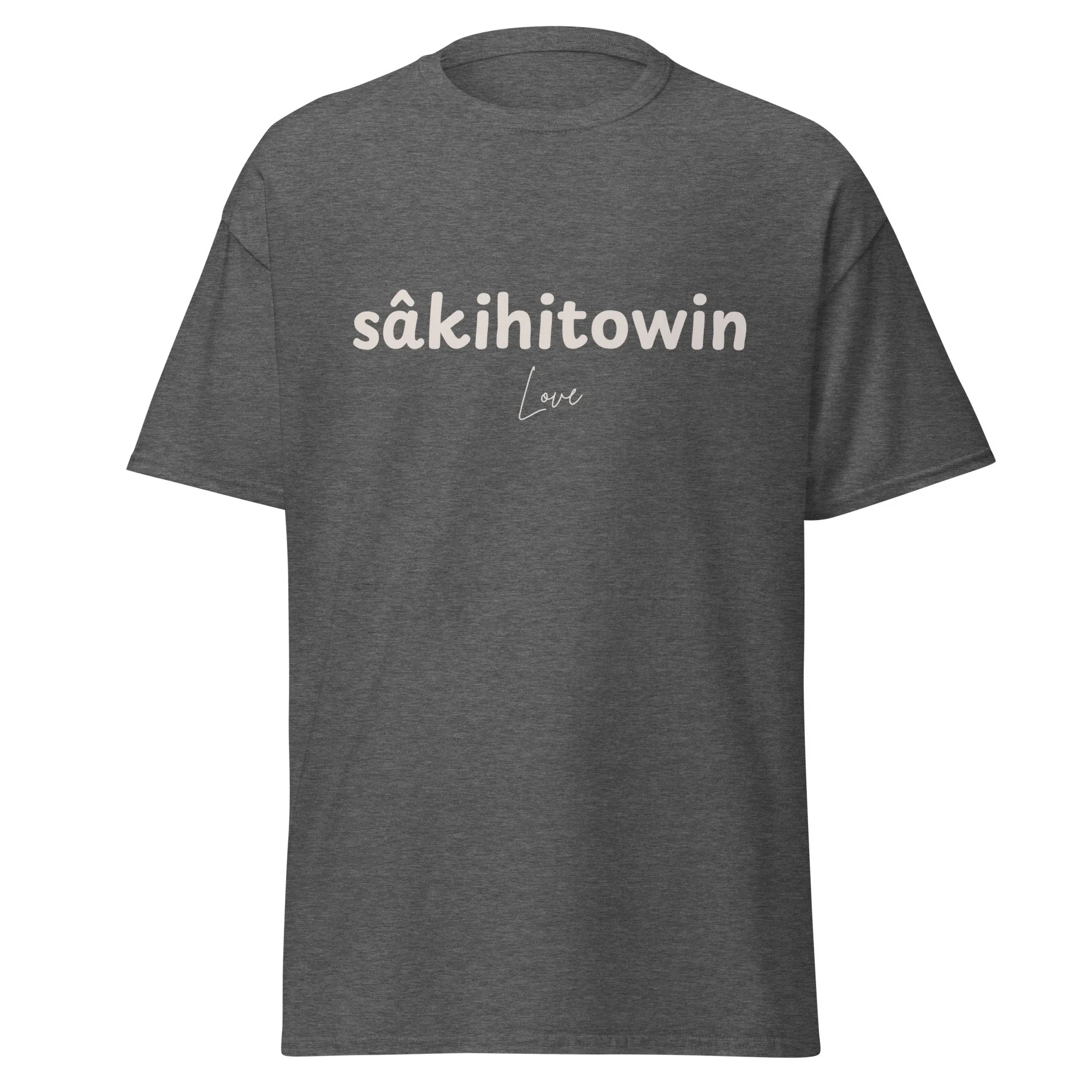 A wearable word of connection. This shirt features the Plains Cree word sâkihitowin, meaning love. Created to spark conversation, honour language, and carry care into everyday life, this piece is part of a collection rooted in story, relationship, and belonging.
